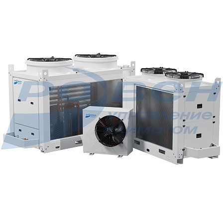Компрессорно-конденсаторные блоки (ККБ) служат для отвода тепла в окружающую атмосферу от фреона (хладоносителя) выходящего из испарителя, путем сжимания входящих газов в компрессоре. При этом процессе поднимается температура газов фреона выше атмосферной. Отвод тепла происходит в теплообменнике под названием конденсатор в котором фреон меняет агрегатное состояние из газожидкостного состояния в жидкое. Подача воздуха через конденсатор осуществляется посредством осевых вентиляторов.